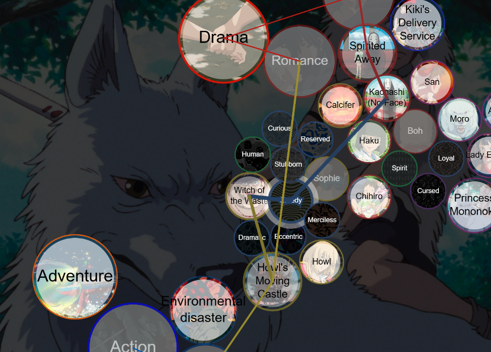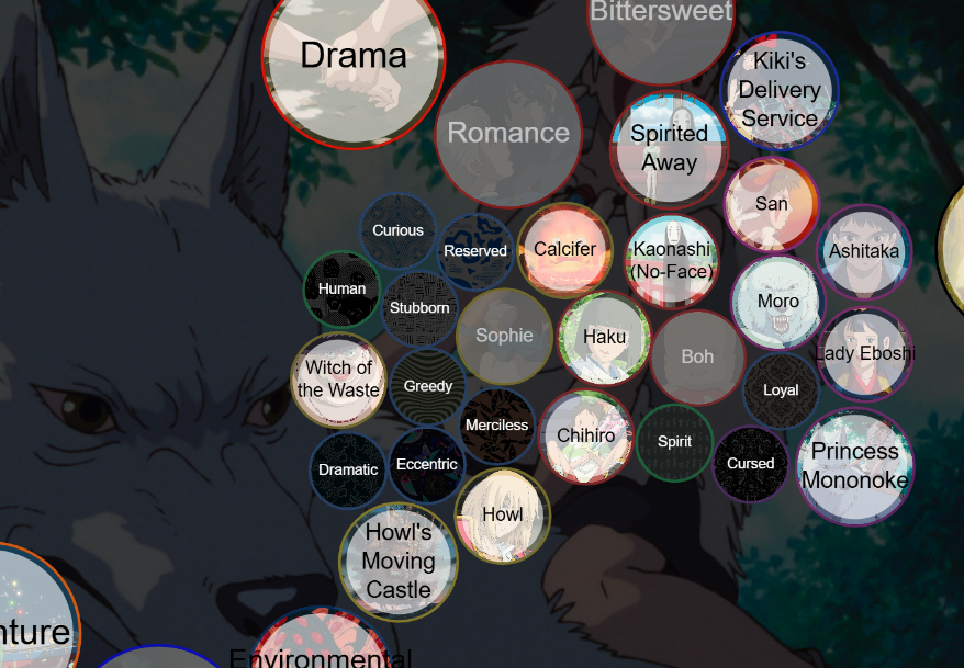 Click here to go to Ghibbles!Studio Ghibli is a renowned Japanese animation film studio known for its distinctive animation style, storytelling and themes. Our webapp has been created to tackle the lack of information accessibility of movies, even on official websites. By creating an interactive webapp, we have aimed to provide a visually engaging way to gain more knowledge about the contents of Studio Ghibli movies. With our project, users were satisfied with the visually pleasing interface and found it informational, as intended. This project was created for the Human Computer Interaction and Information Visualistion course of the Creative Intelligence and Technology programme at Leiden Univeristy.
