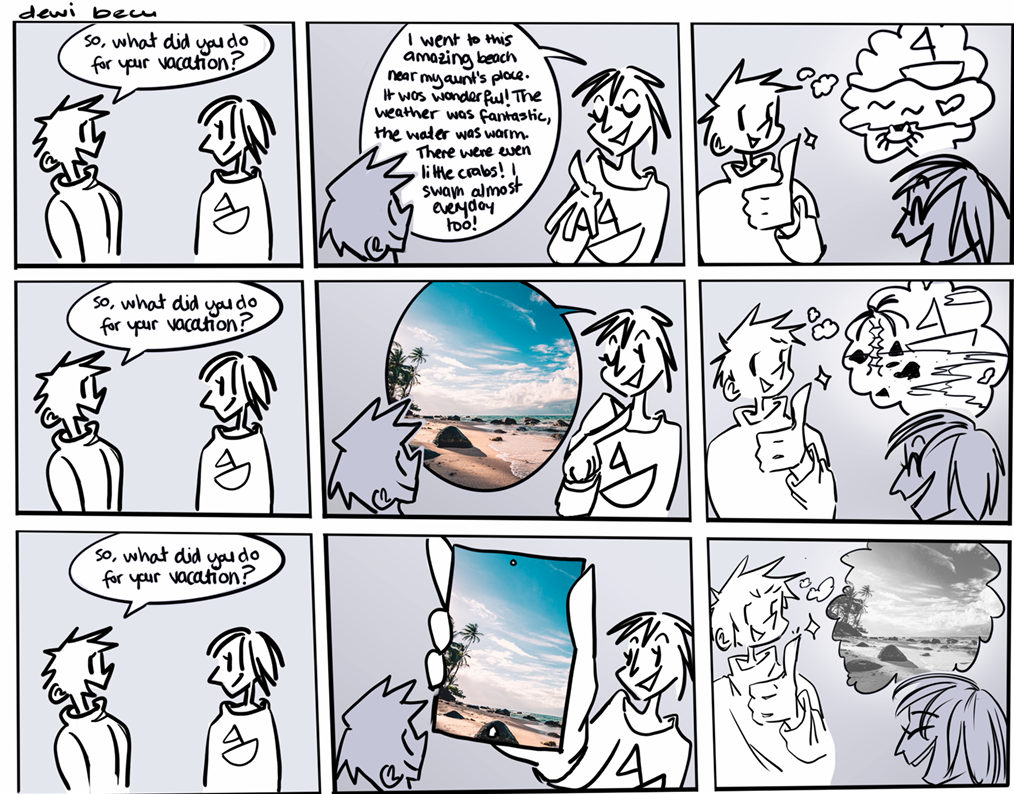 In the first row, the SK can only interpret SM's words through their experiences. In the second row, SK gets a more detailed explanation, but it is still said (image in a speech bubble), so SK has a more detailed interpretation. Instead of being told about the vacation in the last row, they are shown a picture. However, it is still inaccurate compared to SM's image because everything that is perceived by one person will never be the same as that of another person.